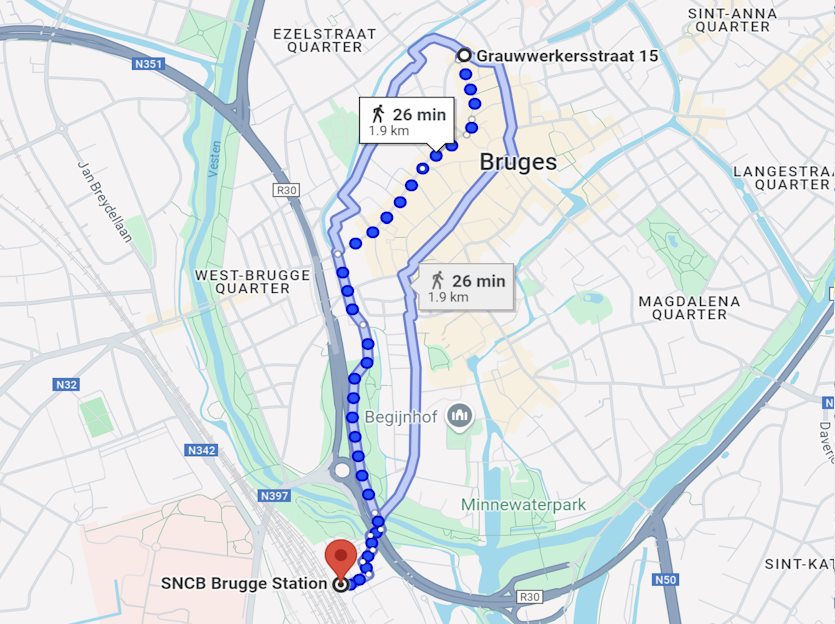 If you come by train: get off at Brugge Station. We are located about 20 minutes away from the station, check out the map below. The walk is really pretty.